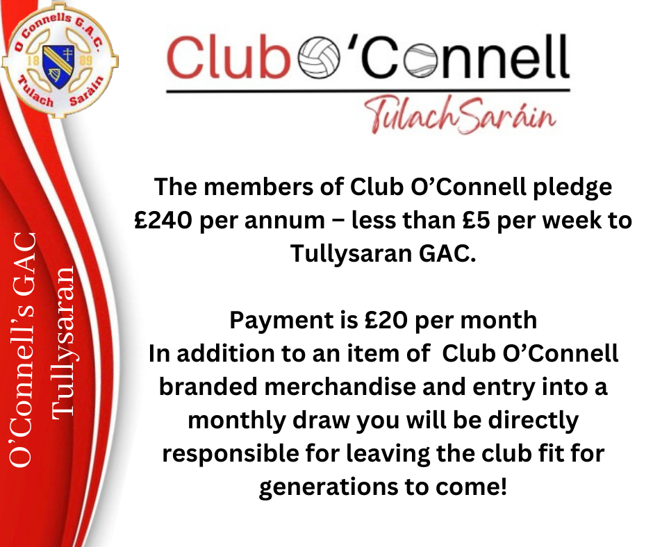 The aim of Club O’Connell is to enable our club to invest in projects that will ensure our club members both present and future have the best training and facilities available.